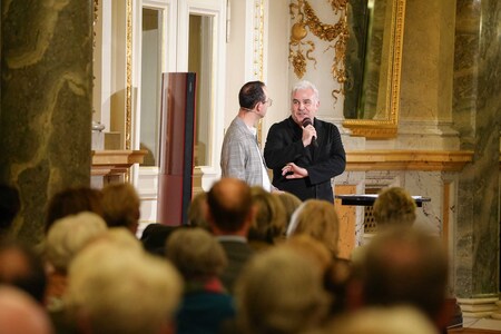Einen poetischen und zugleich geheimnisvollen Abend erlebten zahlreiche Proszenio-Mitglieder und viele neue Interessenten am 1. Dezember 2025 bei The Snow Queen. Zunächst ließ die Einführung in das beeindruckende und technisch aufwendige Bühnenbild durch den Technischen Direktor Jan Seeger Schneesturm und surreale Welten entstehen. Anschließend konnten die Freundinnen und Freunde der Semperoper direkt vom anwesenden Komponisten Hans Abrahamsen erfahren, wie er Schnee und Eis in Töne umsetzt und seine ganz individuelle Tonsprache für dieses Märchen findet. Im Gespräch mit Dramaturg Benedikt Stampfli ließ Regisseur Immo Karaman an seinem besonderen Zugriff auf das Märchen von Hans Christian Andersen teilhaben. Der anschließende Empfang mit Intendantin Nora Schmid bot wieder viel Gelegenheit zum Austausch über das soeben Gesehene und zu Begegnungen unter Freunden.
