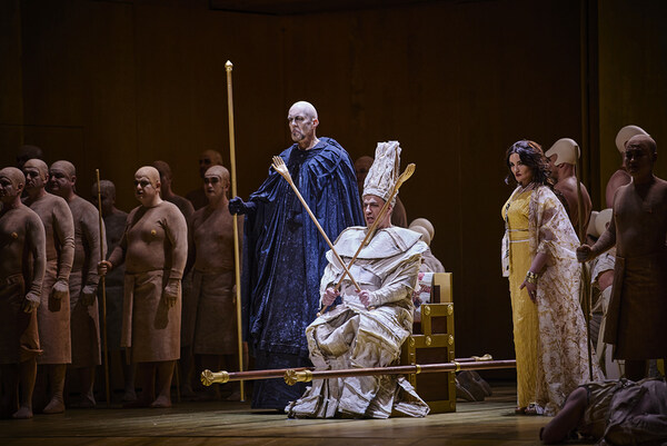 The king declares war against Ethiopia after a messenger reports of the invasion of the Ethiopian troops. Radamès is proclaimed general. War fever breaks out, and Aida joins in as well. Aida is appalled that she is wishing victory for the man who is going to war against her people. In the distress of having to choose between her lover and her fatherland, she wishes for death. In a solemn ceremony, Radamès is prepared for war and given holy weapons.
