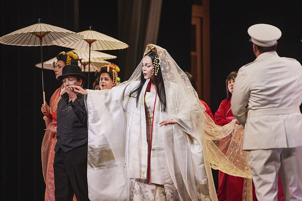 Nagasaki in the 1890s. A wedding is to be celebrated in the garden of a hill-side residence with view of the port: the wedding of the American marine officer B. F. Pinkerton and the 15-year-old geisha Cio-Cio-San, daughter of a samurai who has fallen out of favour. The matchmaker, Goro, explains the building design of the new residence to Pinkerton who is not familiar with this. They are joined by the American counsel in Nagasaki, Sharpless. He highlights the cultural differences to the young American and warns him not to take the marriage lightly which can be short-term according to Japanese custom. Finally, Cio-Cio-San and her family, accompanied by several geishas, enter. After the wedding, Cio-Cio-San’s uncle, the priest Bonzo, storms into the garden and denounces the bride for converting to Christianity. Pinkerton asks the angry guests to leave. Suzuki, a friend of many years of Cio-Cio-San, Pinkerton and Cio-Cio-San remain. In the evening mood, both proclaim their love to each other.