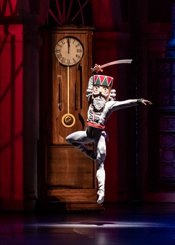Unnoticed by anyone, somebody is watching over the scene with a sparkle in his eyes from his place on the grandfather clock: Drosselmeier.