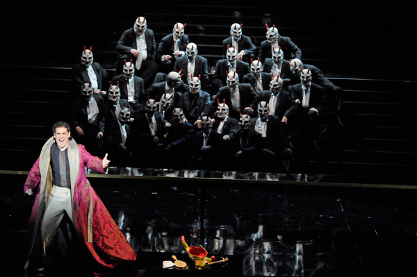 A masqued festival in the palace of the Duke of Mantua. The revelry is in full swing. Despite all the distractions, there is a young girl whom the host cannot get out of his head. Off to one side of the festival, he explains to the courtier Borsa that he must finally have this unknown girl he has seen every Sunday in church for the last three months, and who he knows has a male visitor in the evening. Borsa diverts the Duke's attention to Countess Ceprano. He has never seduced her before. She is reason enough for the Duke to let off steam and at the same time to put down her husband. Rigoletto humiliates Count Ceprano in public. The festival continues. The nobleman Marullo brings spectacular news: Rigoletto has a secret lover. Everyone falls about in mirth. Rigoletto chooses Count Ceprano as the target of his deadly ridicule, and overshoots the mark. The Duke gives him a warning. Count Ceprano incites the courtiers to extract revenge upon Rigoletto. But for now, the party goes on. The Count of Monterone bursts into the middle of the scene. He accuses the Duke of dishonouring his daughter and curses him and Rigoletto, his unscrupulous jester. The atmosphere turns for the worse: the masquerade is over. Rigoletto is overcome by fear for his life.
