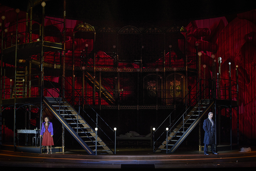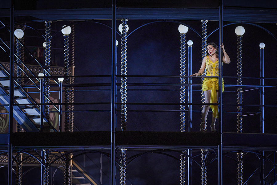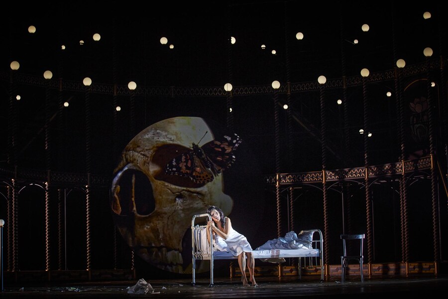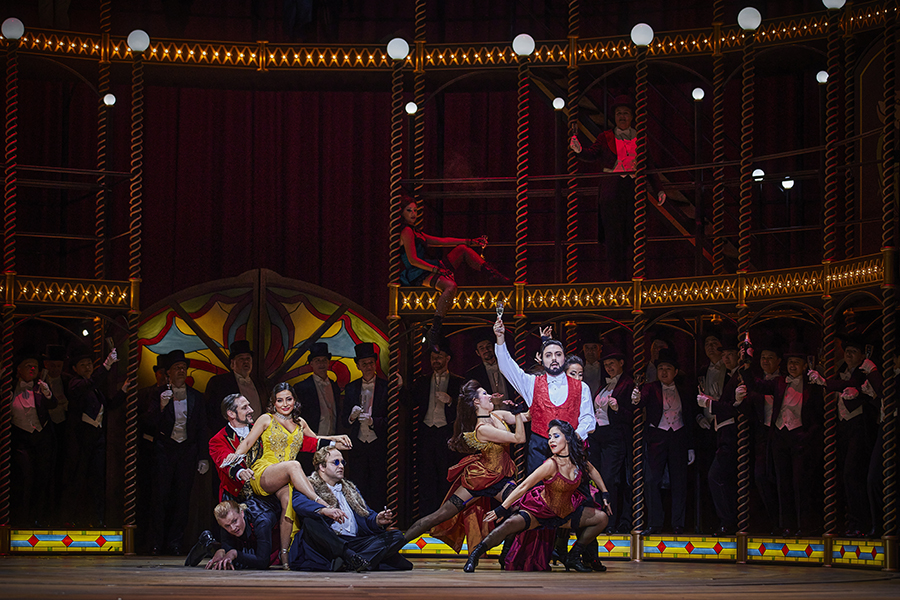 Eine Oper über eine Kurtisane, die an Tuberkulose stirbt und noch dazu einer real existierenden Frau der Pariser Gesellschaft nachempfunden ist, war für die damalige Zeit eine unerhörte Neuerung. Fokussiert auf die Dreiecksbeziehung zwischen Violetta, ihrem Geliebten Alfredo und dessen Vater erschuf Verdi vor allem mit der Figur der Violetta einen Charakter, dessen emotionale Bandbreite das Publikum zwischen lyrisch geführten Belcantostellen und überwältigenden musikdramatischen Ausbrüchen in seinen Bann zieht. Regisseurin Barbora Horáková Joly erzählt La traviata in der schillernden Welt des Varietés des 19. Jahrhunderts.