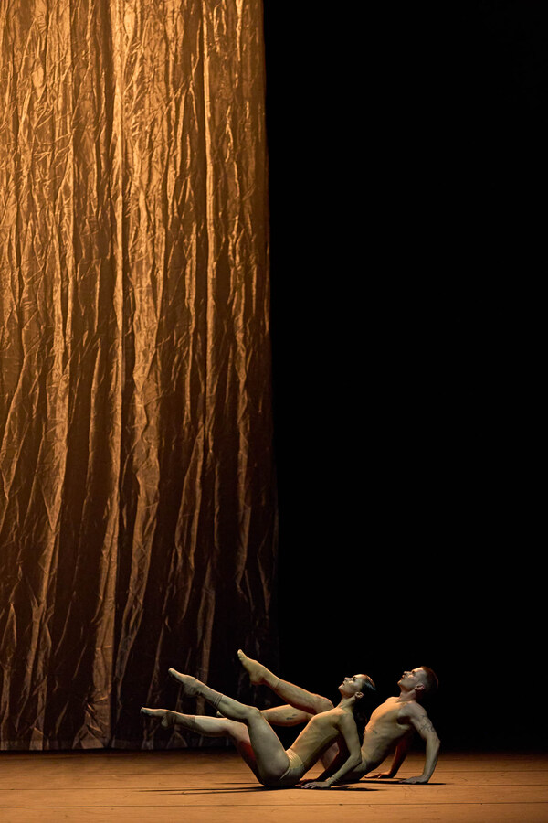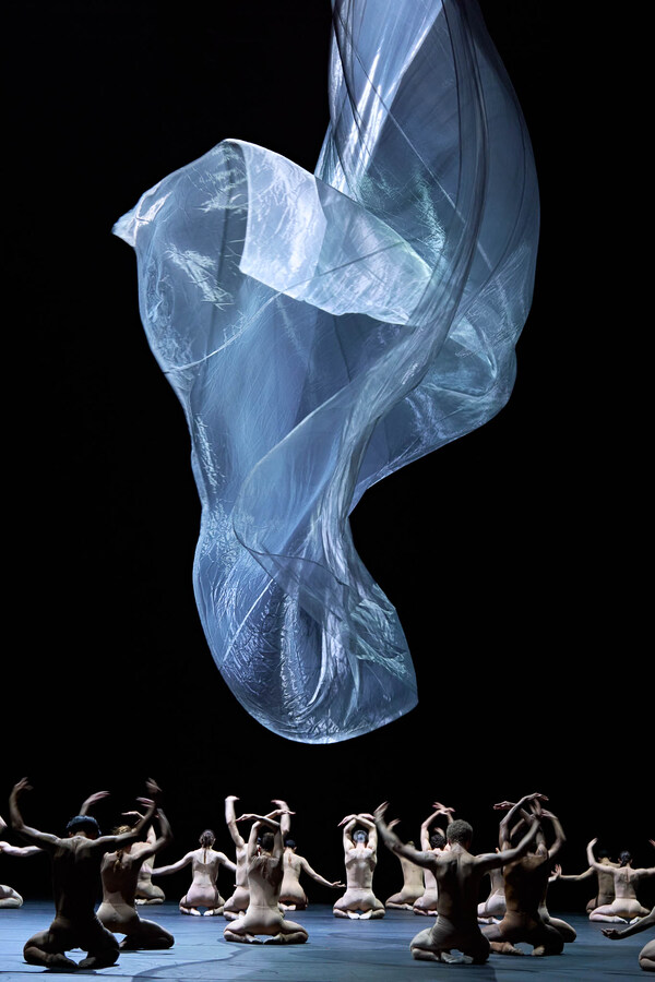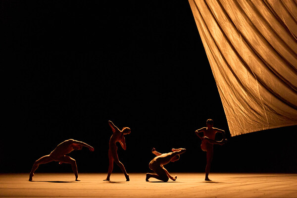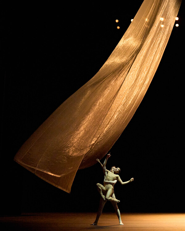 In November, einer Kreation des niederländischen Geschwisterpaares Imre & Marne van Opstal für das Semperoper Ballett, interagieren die Tänzer*innen mit einem riesigen, von der Decke schwebenden Tuch. Körper, Stoff und Licht sind ständig in Bewegung und verschmelzen zu einem poetischen Tanz, zur mal weich fließenden, mal stürmischen Musik von Arvo Pärt.